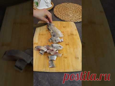 На изображении представлен процесс разделывания рыбы на кухонной доске. Рука человека держит рыбу, часть которой уже нарезана на куски. На столе также видны салфетка и плетеная корзинка.