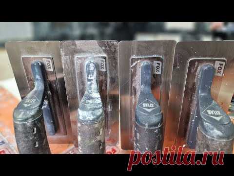 Ряд шпателей для штукатурных работ, загрязненных остатками строительного материала, стоят вертикально и частично обернуты в пленку.