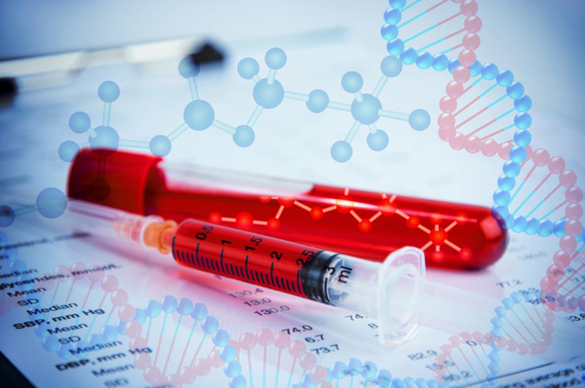 На изображении представлены медицинские предметы, включая шприц и пробирку с красной жидкостью, которая предположительно является кровью, на фоне документов с данными и молекулами ДНК, что намекает на медицинские исследования или лабораторные анализы.