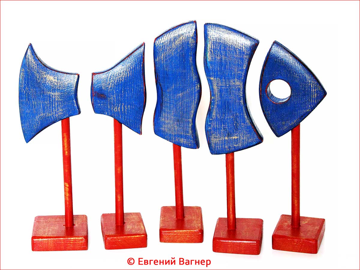 На изображении представлены четыре деревянные скульптуры, окрашенные в синий цвет на красных деревянных подставках. Скульптуры выглядят как абстрактные или стилизованные рыбы.