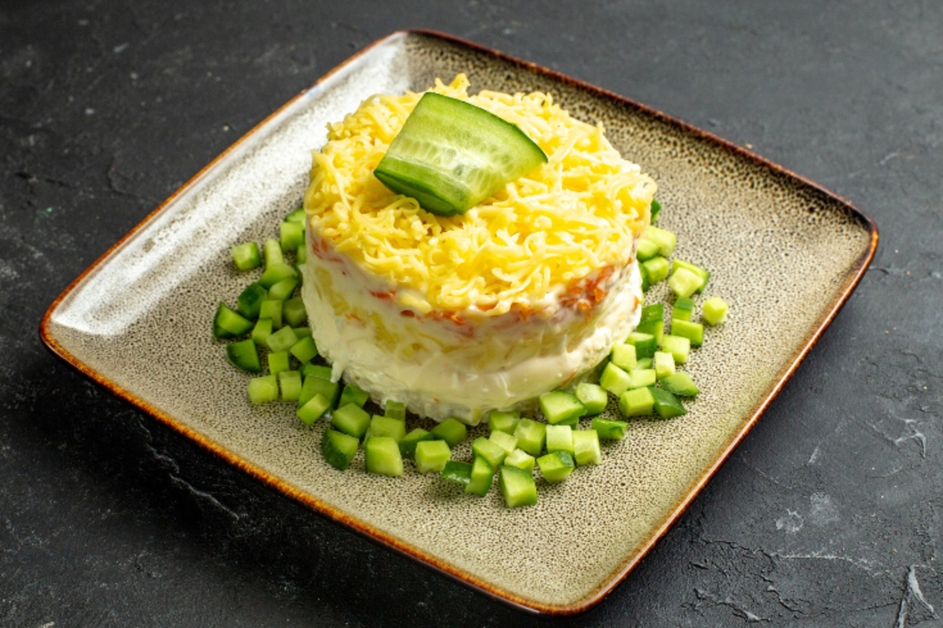 На изображении представлена тарелка с салатом, украшенным слоями. Верхний слой салата посыпан тертым желтым сыром, а посередине украшен кусочками огурца. Вокруг салата на тарелке аккуратно разложены кубики зеленого огурца. Подача блюда аккуратная и эстетичная, подходит для праздничного стола.