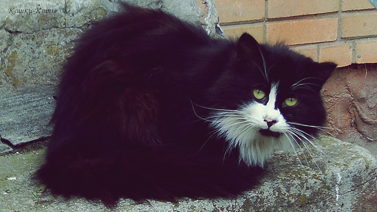 Черно-белая кошка с зелеными глазами лежит на каменной поверхности возле кирпичной стены.