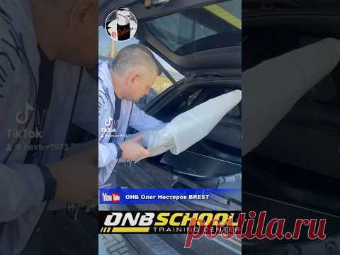 На изображении мужчина в одежде, похожей на полицейскую форму, что-то проверяет в автомобиле. Яркие элементы графики и текста намекают на то, что это кадр из видео, возможно, обучающего или информационного характера.