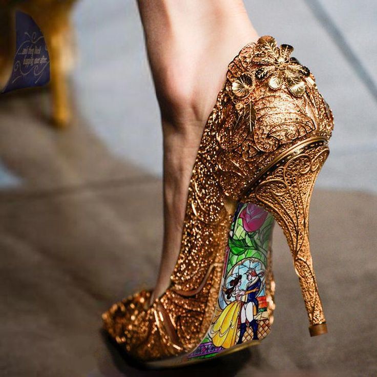 На фотографии изображена женская нога в элегантном золотистом туфле на высоком каблуке с богатой декоративной отделкой. Стиль обуви выделяется экстравагантной формой и кажется очень роскошной.