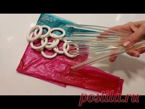 На изображении рука человека держит прозрачные пластиковые трубочки, через которые продеты белые пластиковые кольца. Под трубочками находятся цветные целлофановые пакеты красного и синего цветов. Возможно, это материалы для рукоделия или искусства.