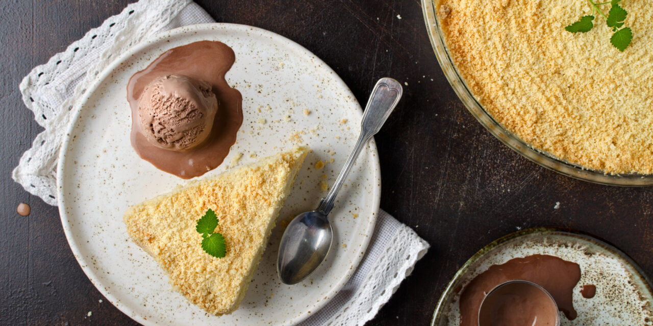 На изображении представлен кусок пирога или торта, украшенный мятой и поданный с шариком шоколадного мороженого на тарелке. Видно, что рядом есть еще одно блюдо с пирогом и столовая ложка. Фон темный, а под сервировочной посудой кружевная салфетка.