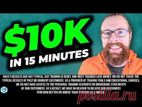 Изображение мужчины с рыжей бородой и в оранжевой куртке, с текстом, который говорит "$10K за 15 минут". Фон ярко-зеленый, и есть предупреждающий текст о том, что торговля на дневном рынке сопряжена с рисками, а результаты не являются типичными.
