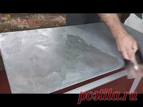 Человек выравнивает слой чего-то похожего на цемент или шпатлевку на поверхности стола. Возможно, это часть процесса отделки или ремонта. Изображение имеет низкое разрешение и водяной знак "postila.ru".