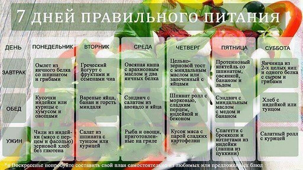 Изображение меню на неделю с указанием дней и приемов пищи (завтрак, обед, ужин), включающее в себя разнообразные блюда и напитки для соблюдения правильного питания.