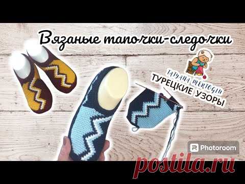 Вязаные тапочки-следки различных цветов и узоров на светлом фоне. В верхней части изображения пара тапочек с зигзагообразным узором в коричневых и белых тонах. В нижней части еще одна пара тапочков с сине-белым узором. Подписи на изображении отмечают "Вязание мелким узором" и "Турецкие узоры". Весь образ предполагает ручную работу и домашний уют.