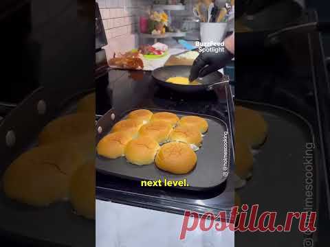 На изображении представлена кухонная сцена, где на электрической вафельнице готовятся булочки. В фоне видна кастрюля, в которой жарится яичница. Атмосфера напоминает домашний уют или кафе.