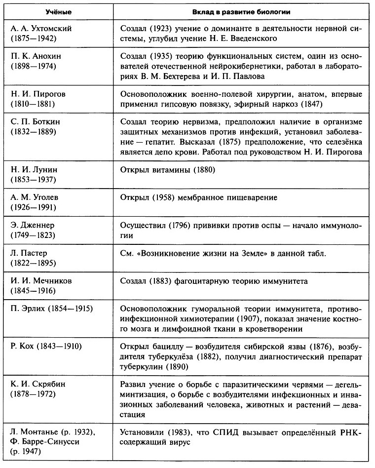 Изображение содержит текст на русском языке, который представляет список фамилий и достижений различных ученых и медиков, внесших значительный вклад в развитие биологии. Текст организован в виде таблицы с двумя колонками, в первой указаны имена ученых с годами жизни, во второй перечислены их вклады и открытия.