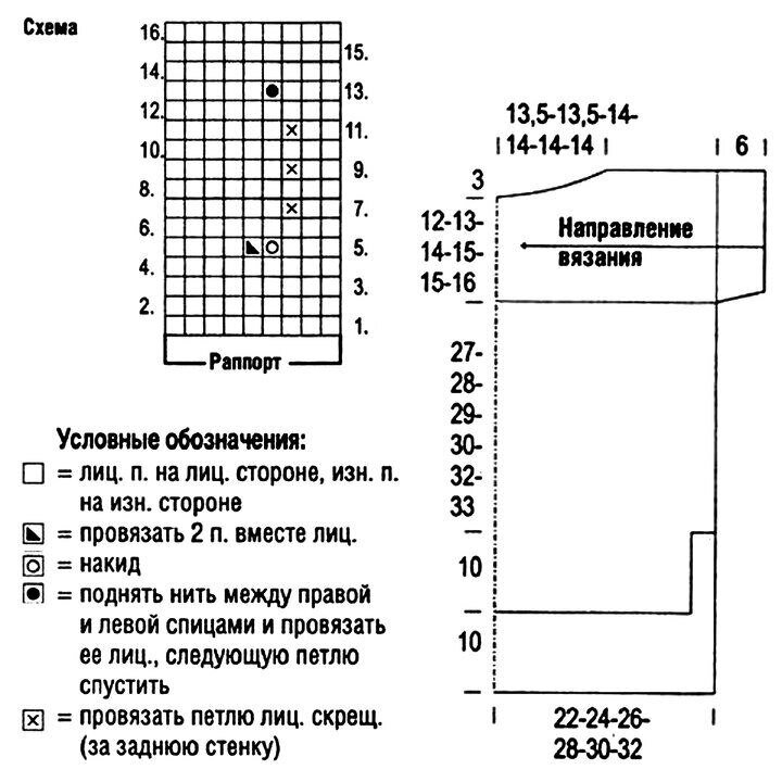 Изображение демонстрирует схему вязания и объяснение условных обозначений для создания вязаного изделия. На схеме изображены ряды с номерами и различные символы, представляющие разные типы петель и вязальных техник. Также присутствует столбец с указанием направления вязания.