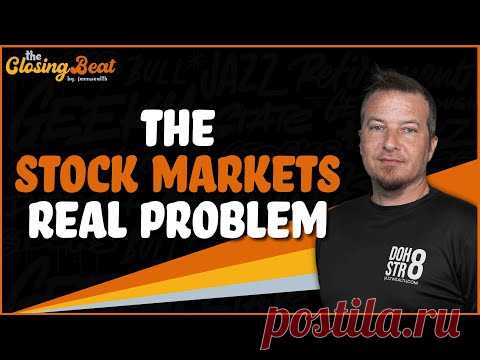 На изображении мужчина в футболке с логотипом, стоящий рядом с текстом "THE STOCK MARKETS REAL PROBLEM" на оранжево-черном фоне. Это похоже на обложку видео или подкаста о финансовых рынках.