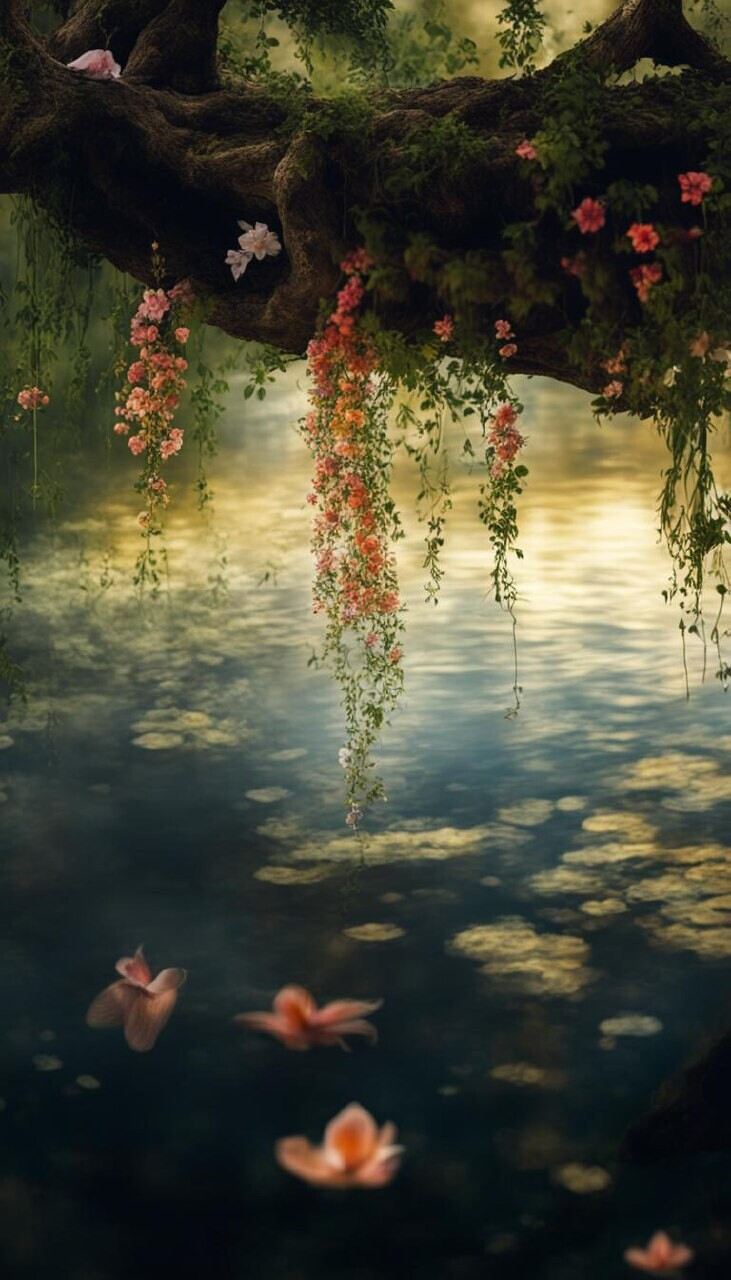 На изображении видны ветви дерева, усыпанные цветами, свисающие над водной гладью. Образуется отражение цветов в воде, а на поверхности плавают опавшие лепестки.