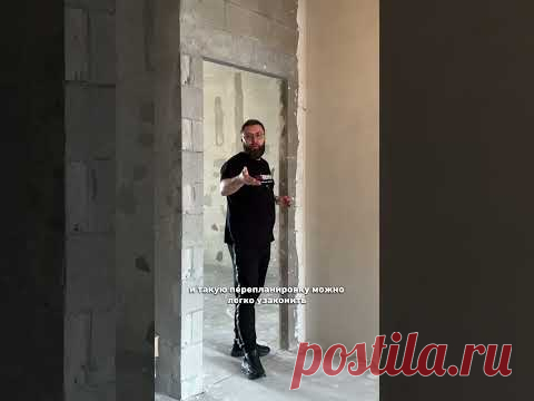 Мужчина в черной одежде стоит в проеме двери на фоне строительных лесов внутри здания. На изображении также присутствует текст на русском языке.