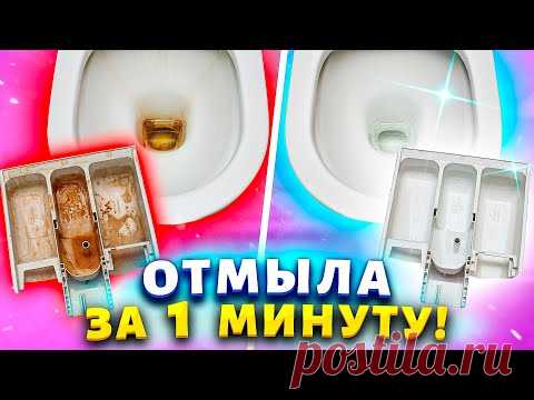 Изображение до и после очистки унитаза и ванны. Слева грязные, с пятнами, справа чистые. Надпись на русском языке гласит: "Отмыла за 1 минуту!".