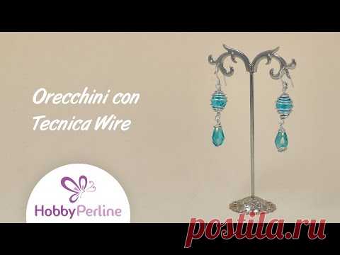 На изображении представлены серьги в технике Wire на подставке для украшений. Они имеют голубые камни и металлические элементы. В нижней части изображения логотип "HobbyPerline" и текст, предположительно, связанный с итальянским языком и рекламой украшений.