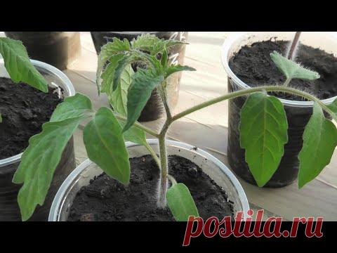 Рассада помидоров в прозрачных пластиковых стаканах с землей.