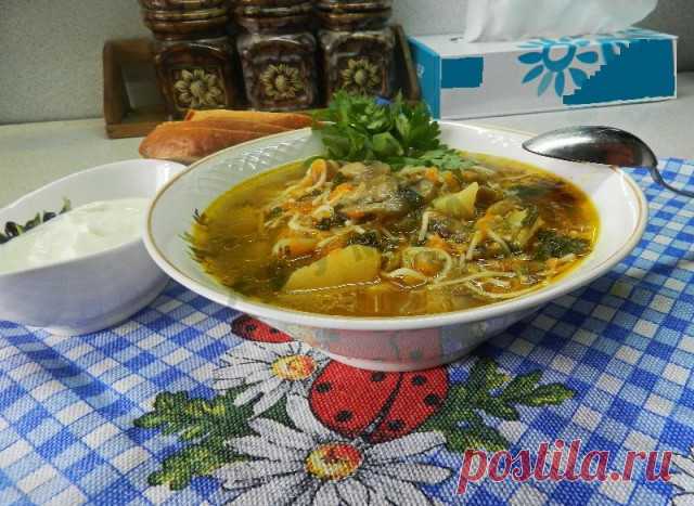 - Шаг 1: Необходимые продукты. Можно взять свежие шампиньоны, тогда их надо 150 грамм.Шаг 2: Лук и морковь измельчаем.Шаг 3: Мультиварку включаем на режим Жарка, 140 градусов. Наливаем масло, кладем овощи, и слегка обжариваем в течение пяти минут.Шаг 4: Затем кладем шампиньоны, сливочное масло, перемешиваем, крышку закрываем и готовим еще десять минут.Шаг 5: Картошку нарезаем кубиками. Шаг 6: Кладем в чашу, добавляем бульонный кубик, специи, немного соли.Шаг 7: Вливаем бульон и готовим до окончания режима. Затем переводим мультиварку на режим Суп, один час.Шаг 8: За десять минут до окончания режима кладем вермишель и петрушку, перемешиваем, доводим до кипения и отключаем. Настаивать этот супчик не надо.Шаг 9: Сервируем и подаем со сметаной. Приятного аппетита!