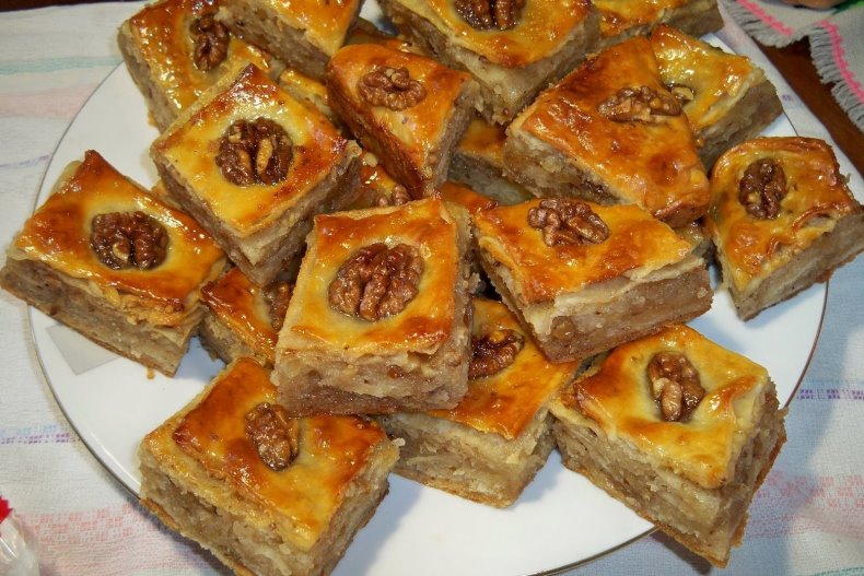 Предлагаем домашний рецепт медовой пахлавы из готового слоеного теста с сухофруктами.