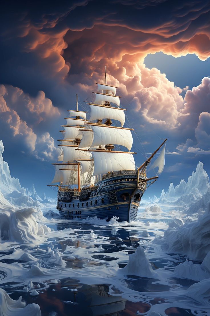Парусник снующий среди ледяных глыб под темными облаками на фоне синего неба.