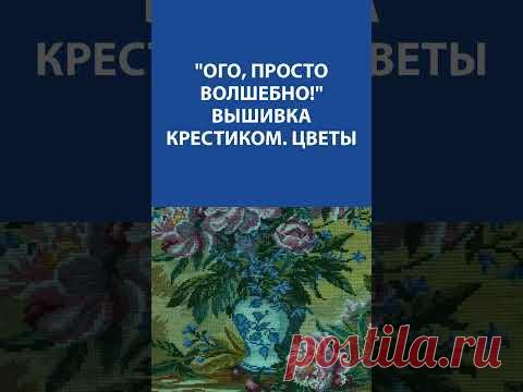 Изображение представляет собой коллаж из двух частей: верхняя часть содержит текст "ого, просто волшебно! ВЫШИВКА КРЕСТИКОМ. ЦВЕТЫ", а нижняя часть показывает фрагмент ткани с вышивкой крестиком, на которой изображены цветы. Весь коллаж выполнен в синих и зеленых тонах с акцентами других цветов. В правом нижнем углу находится логотип "postila.ru".