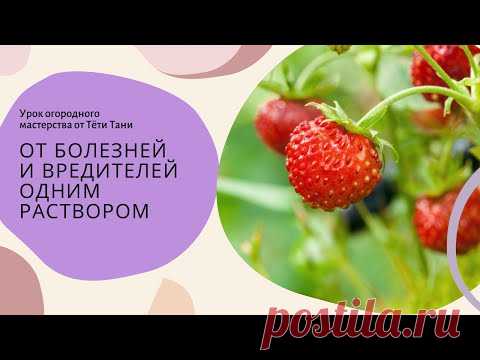 На изображении рекламный баннер с изображением созревающих земляничных ягод и текстом, предлагающим урок садоводческого мастерства от Тети Тани. Текст утверждает эффективность одного раствора против болезней и вредителей. В правом нижнем углу находится ссылка на веб-сайт.