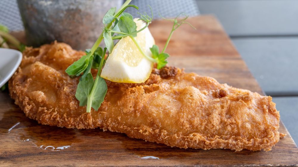 На изображении подается жареная рыба в кляре с ломтиком лимона и зеленью на деревянной подложке. Подача блюда выглядит аппетитно, предназначена для сервировки в ресторане или кафе.