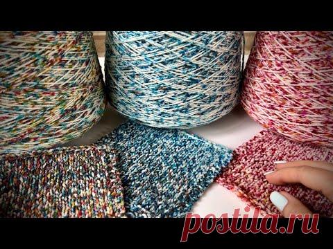 На изображении представлены вязаные образцы и мотки пряжи разного цвета. В нижней части кадра видна рука человека, держащая вязаный образец.