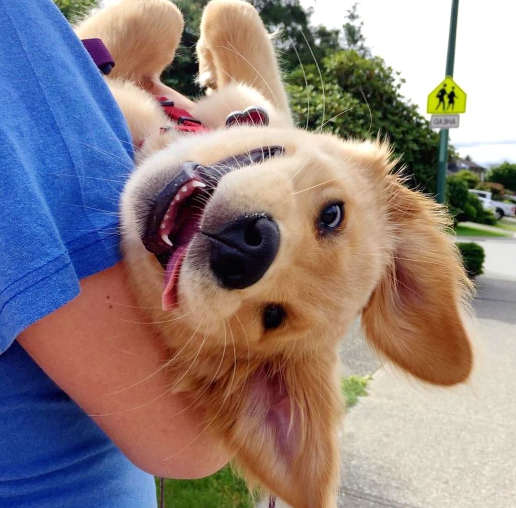Счастливая собака на руках у человека, язык собаки высунут и она кажется в восторге. На заднем плане видна улица.