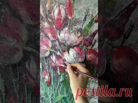 На изображении видна рука художника, который рисует кисточкой цветы на холсте. Работа выполнена в живописном стиле, цветы кажутся текстурными и наполненными жизнью.