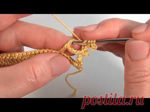 На изображении показан процесс вязания крючком. Видны руки человека, который держит крючок и пряжу, выполняя вязальный узор.