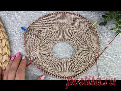 На изображении представлено вязание круглого элемента, возможно начало шляпы или коврика. Видно спицы с кружевным узором и руку, держащую вязальное изделие на фоне тканевой поверхности.