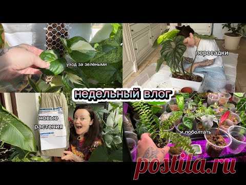 Коллаж из различных сцен, связанных с уходом за растениями. На фотографии изображены рука, держащая лист растения, упаковка с новыми растениями, женщина, занимающаяся пересадкой растений в горшки, и коллекция растений в домашних условиях. Также присутствует текст "недельный влог" и "люблю растения", подчеркивающий, что изображение вероятно относится к видеоблогу о растениях.
