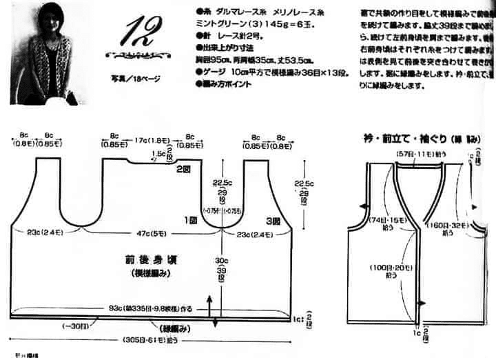 Изображение является сканом японского журнала или инструкции по шитью, показывающее выкройки для одежды. В верхней левой части помещена фотография манекена или модели в одежде, а также присутствует текст на японском языке, возможно, содержащий описание модели, инструкции или рекомендации. В остальной части изображения приведены детальные схемы выкроек для создания частей одежды, включая мерки и аннотации на японском.