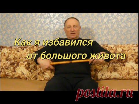 На изображении мужчина сидит на диване, руки расположены по бокам. Надпись на изображении на русском языке гласит: "Как я избавился от большого живота". Фон - обои и диван с узором.
