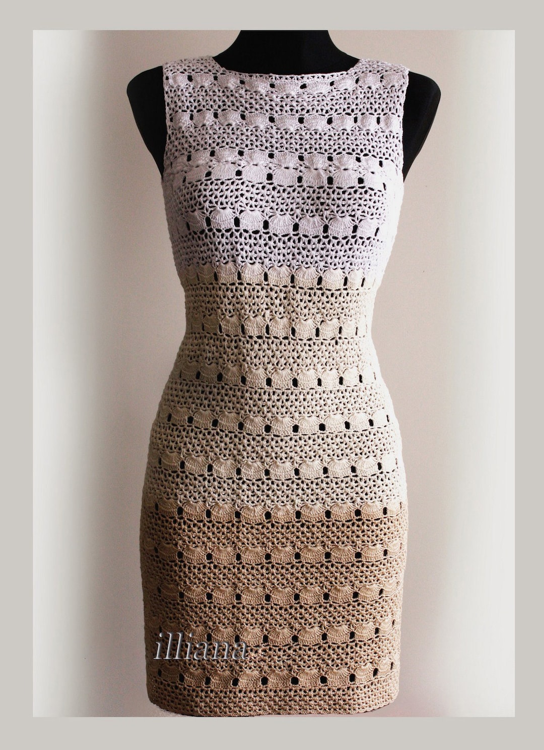 На изображении представлено вязаное платье без рукавов, на манекене. Платье выполнено в стиле омбре, цвета плавно переходят от светло-серого в верхней части к темно-бежевому внизу. Узор платья состоит из чередования вязаных мотивов и отверстий, создающих декоративный эффект.