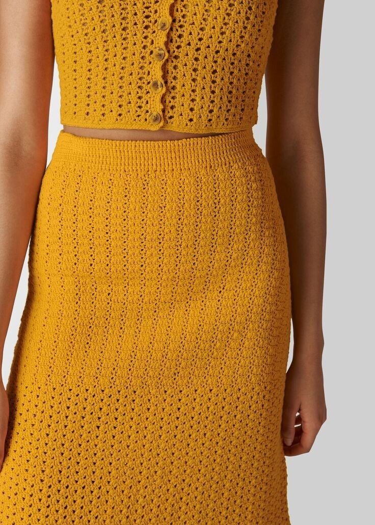 Женская одежда вязаного стиля желтого цвета. Изображение показывает верхнюю часть юбки и часть топа с застежкой на пуговицы.