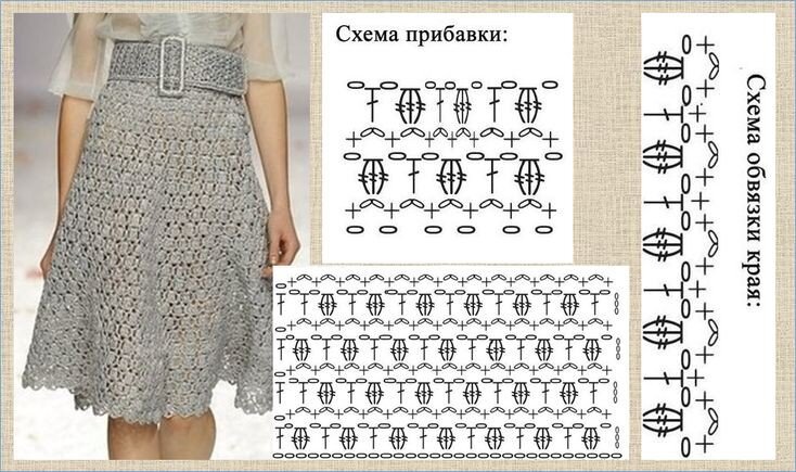 Комбинированное изображение, где слева показана женщина в вязаной юбке, а справа представлены схемы для вязания: схема прибавки и схема обвязки края. Внизу, на изображении, размещена ссылка на веб-сайт "povituhu.ru".