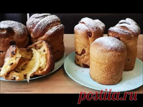 На фотографии изображены куличи, традиционные пасхальные сладкие хлебы, присыпанные сахарной пудрой, один из них разрезан, показывая внутреннее содержимое с изюмом.