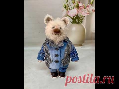 Игрушечный медведь в джинсовом пальто и черных ботинках на фоне вазы с цветами.