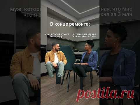 На изображении находятся три человека, сидящие друг напротив друга. Один мужчина и две женщины, по всей видимости, обсуждают что-то в комнате, которая выглядит как недавно отремонтированная. Сверху на фотографии есть текст на русском языке, который переводится как "В конце ремонта: муж, который думает, что я кукла, я, думающая что мне нужен шкаф за 3 млн." Судя по всему, это мем или шутка о ремонте и домашних расходах.
