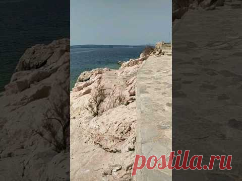 Изображение каменистого побережья рядом с морем. На переднем плане видна каменная поверхность, которая кажется частью большого плато или скалы. Вдалеке виднеется горизонт, где небо встречается с водной поверхностью.