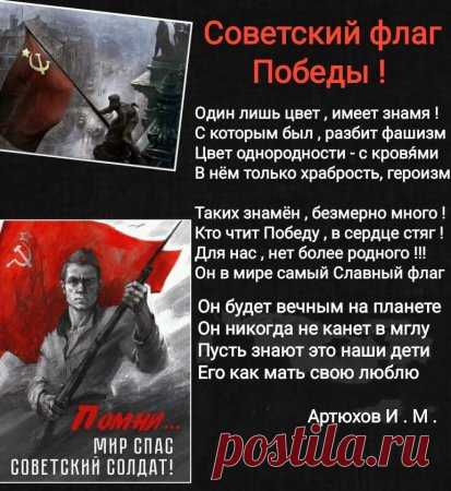 На изображении пропагандистский плакат с изображениями солдат и красным флагом. В верхней части слева изображён солдат с красным флагом на фоне города, в нижней части - портрет солдата, держащего флаг. Текст на плакате на русском языке восхваляет Советский флаг и его значение победы, отваги и героизма. Под изображениями находится напоминание "Помни - мир спас советский солдат!" и логотип "postila.ru".