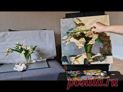 На изображении представлен процесс рисования картины масляными красками. Художник держит палитру с красками и кисть, создавая натюрморт на холсте, стоящем на мольберте. Рядом на столе видны белые цветы в вазе, которые служат образцом для картины.