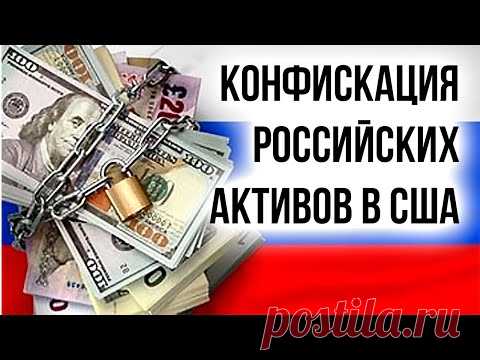 Изображение купюр американских долларов, скованных цепью, на фоне флага России с текстом "конфискация российских активов в США" и логотипом веб-сайта