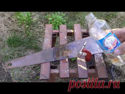 На изображении показано, как из пластиковой бутылки с красной крышкой и наклейкой с написанием на русском языке льётся жидкость на ручную пилу, лежащую на деревянной подставке. Всё это находится на фоне травы.