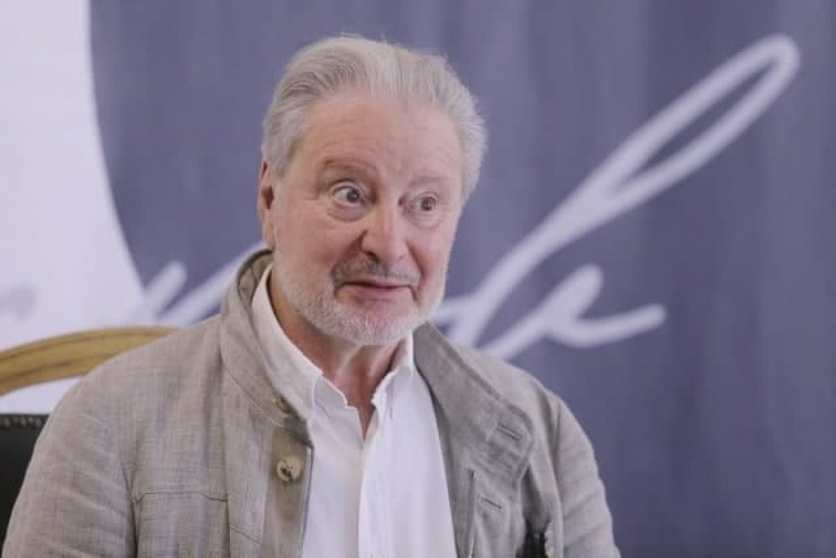 На фотографии изображен пожилой мужчина, который находится в помещении и сидит на стуле. Мужчина носит светлый пиджак и белую рубашку. Он выглядит заинтересованным или участвующим в беседе. Интерьер кажется официальным или предназначенным для мероприятий.
