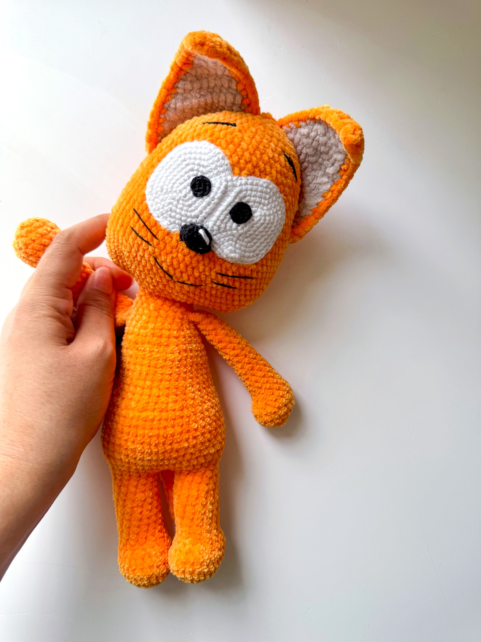 Ручная работа вязаная игрушка в виде оранжевого кота, которую держит человек.